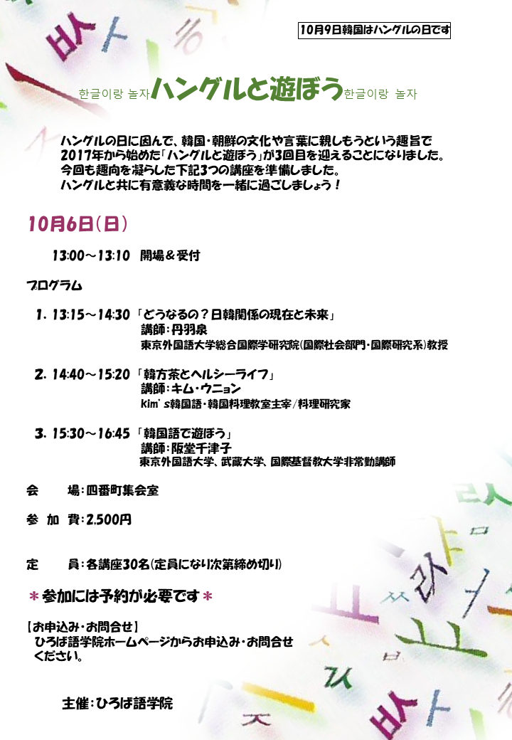 ハングルの日に因んで、韓国・朝鮮の文化や言葉に親しもうという趣旨で2017年から始めた「ハングルと遊ぼう」が3回目を迎えることになりました。 今回も趣向を凝らした下記3つの講座を準備しています。 1. どうなるの?日韓関係の現在と未来 講師:丹羽泉 東京外国語大学総合国際学研究院(国際社会部門・国際研究系)教授 2. 韓方茶とヘルシーライフ...