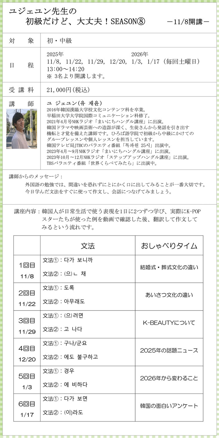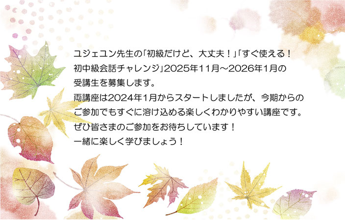 2025/10/09 ユジェユン先生の「初級だけど、大丈夫!」「すぐ使える!初中級会話チャレンジ」受講生募集! 1. お申込み締切日:2025年11月1日(土) お申込みはこちら>> 2. お申込み締切日:2025年11月1日(土) お申込みはこちら>> 戻る tagPlaceholderカテゴリ: