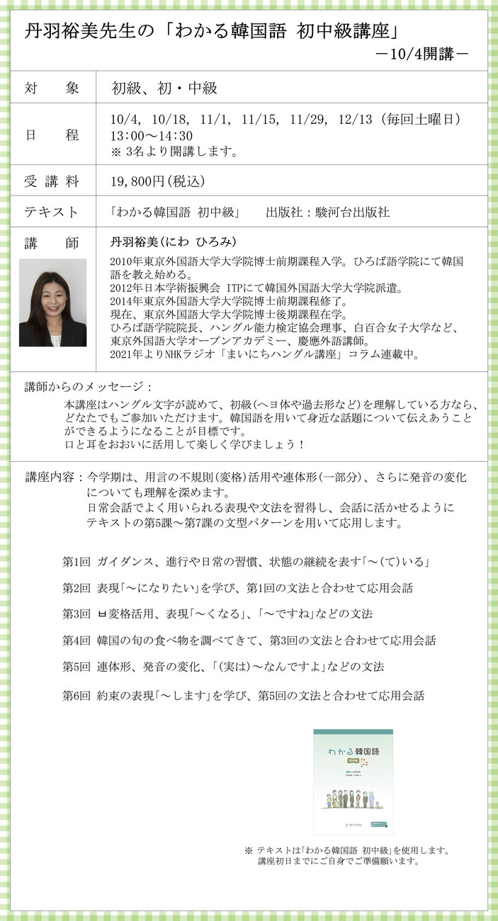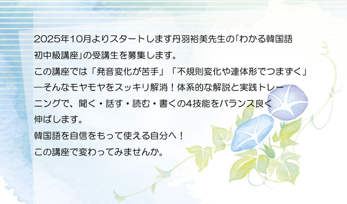 丹羽裕美先生の「わかる韓国語 初中級講座」受講生募集!